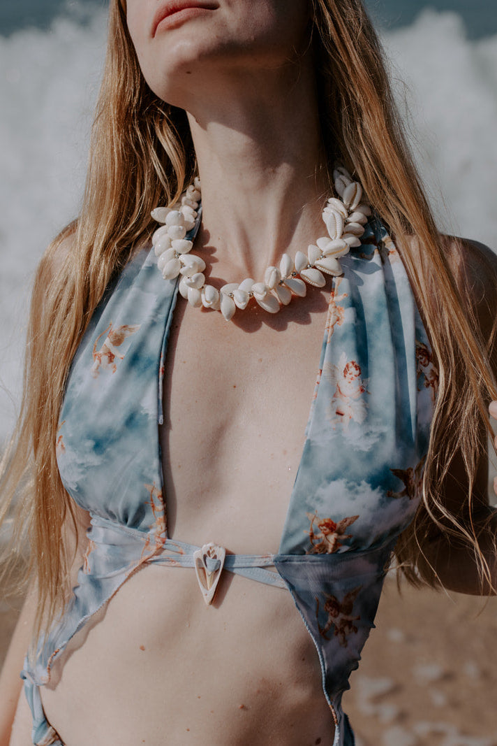 Featuring a dreamy angelic cloud print on delicate mesh, this piece captures the essence of divinity and modern femininity. The plunging halter neckline and delicate tie-front detail create a flattering silhouette, while the shell embellishment adds a touch of bohemian charm.