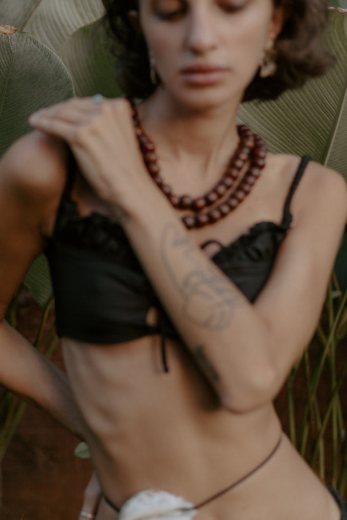 Embrace a touch of dark romance with the Oaurania Bikini Top. This striking top features a sleek, black design with delicate ruffle detailing along the bustline, adding a touch of feminine allure. The corset-style front tie detail creates a captivating focal point, while the thin, ruched straps offer a delicate and adjustable fit. From sun-drenched beaches to moonlit soirées, the Oaurania top makes a statement—because you were never meant to blend in.